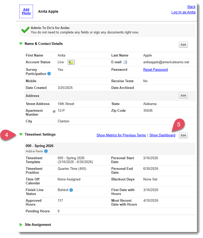 | 4) Approved Hours | This section shows the number of Goal Hours completed and approved to date. |