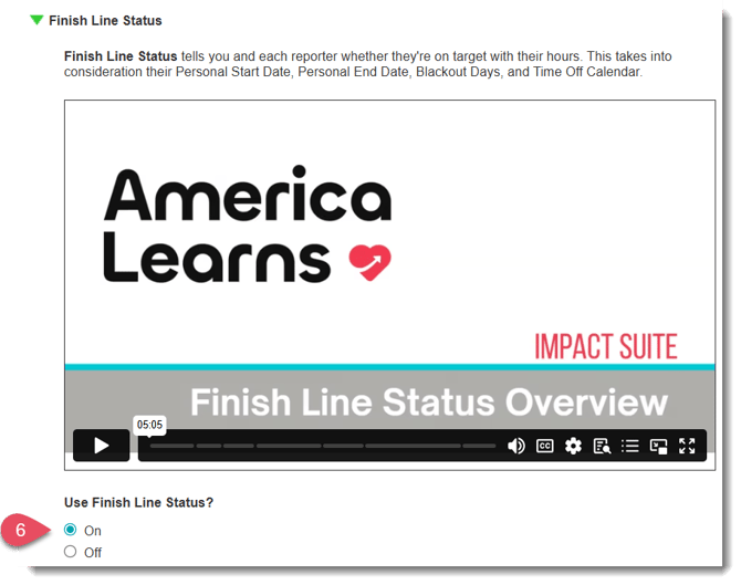 IMPORTANT: Finish Line Status is only intended to be used for reporters with a set number of Goal Hours in a defined timeframe or term. It should not be used for reporters without these requirements.