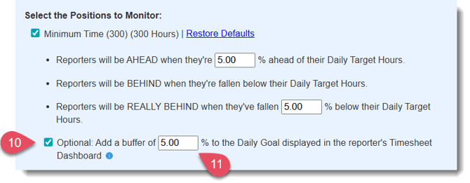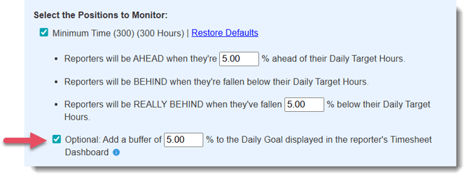 - For each Timesheet Position, you can add a custom buffer to the Daily Goal shown on the reporter’s Timesheet Dashboard. This buffer does not increase the total Goal Hours.