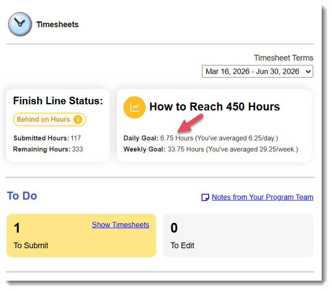 The Daily Goal is the number of hours a reporter is expected to serve each Available Day moving forward, as shown on the Timesheet Dashboard. It updates based on the hours the reporter has already submitted, the date the dashboard is being viewed, and the reporter’s personal Timesheet Settings.