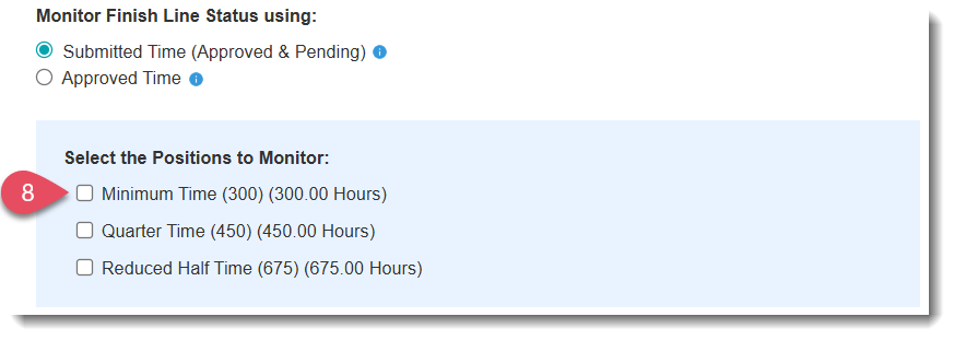 NOTE: Timesheet positions with 0 Goal Hours will not be selectable to be monitored. Finish Line Status is only intended to be used for reporters with a set number of Goal Hours in a defined timeframe or term.