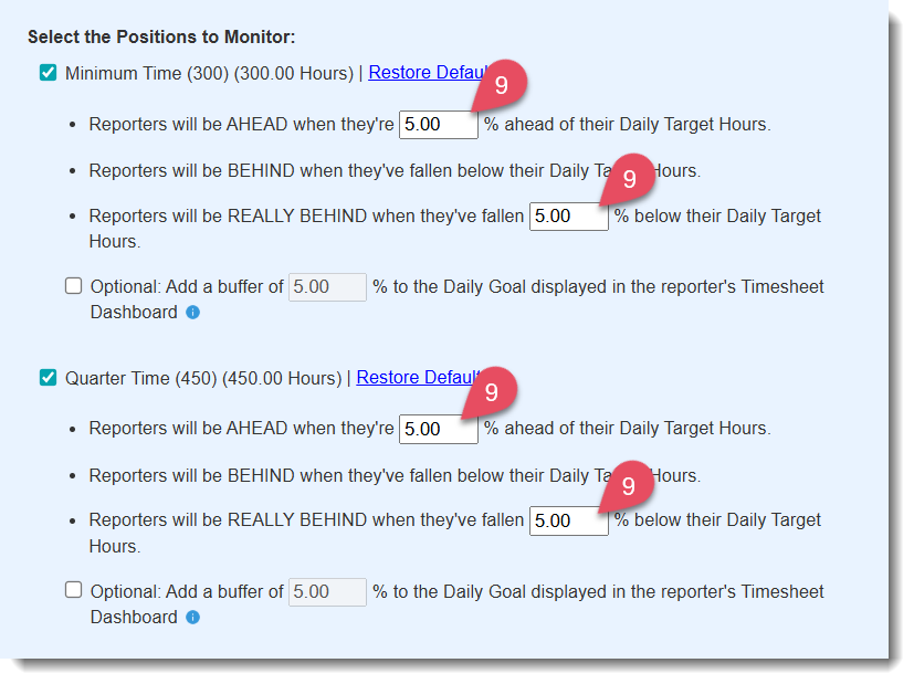 - For each Timesheet Position, you can customize when reporters will see the Ahead or Really Behind status. A higher percentage means there's more flexibility — a larger gap is allowed between their Target Hours and Daily Goal before the status changes.