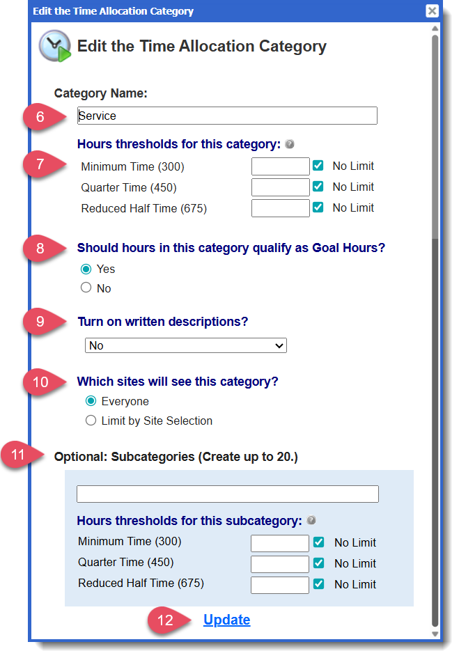 IMPORTANT: If you create Subcategories, reporters will not enter time directly into the Category (e.g., “Service”). Instead, they’ll distribute their time across the Subcategories you’ve defined. All subcategory hours will roll up under the Category.