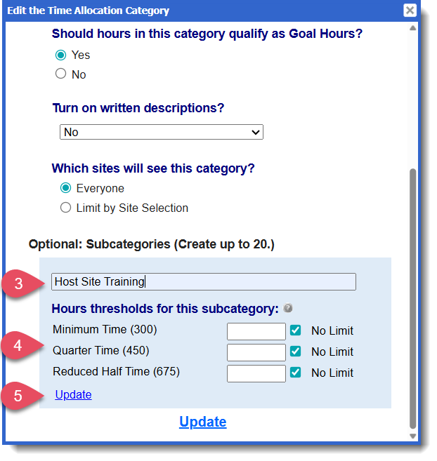 - (Optional) Hour threshold for this subcategory: You can set hours thresholds (expected number of hours) for each Subcategory, based on each Timesheet Position.