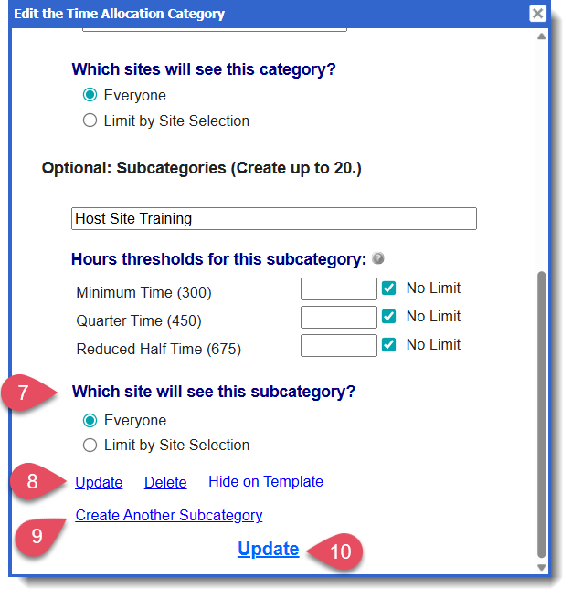 - Hide on Template - Hide the subcategory on any unsubmitted timesheets. This will not delete data already submitted under this subcategory.