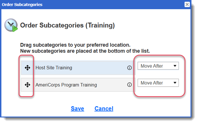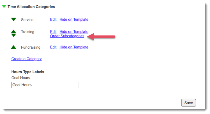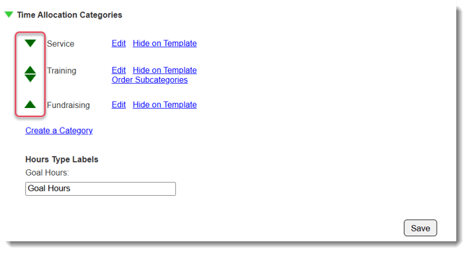 Use the green triangles to the left of each category name to determine the order in which the categories will appear on timesheets: