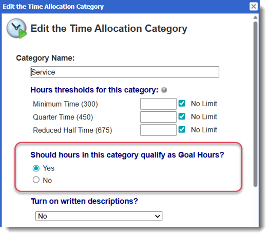 - Next, you’ll see a section that reads, Should hours in this category qualify as Goal Hours?