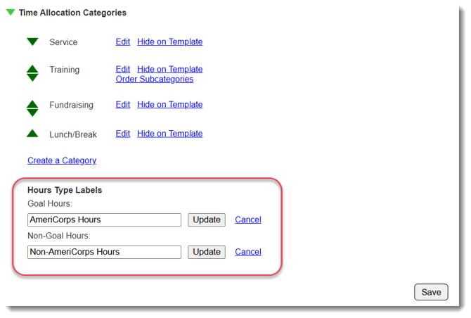 After you’ve created your categories, you can update the Goal Hours and Non-Goal Hours labels so the language reflects your program’s culture and terminology: