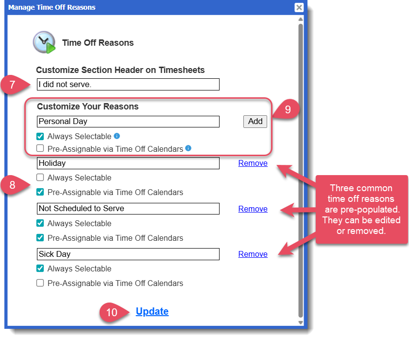 NOTE: Edits to time off reason settings take effect immediately for any unsubmitted timesheets.