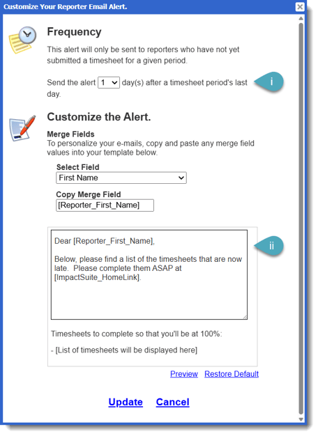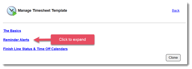 This section of the Timesheet Template lets you set up reminder messages that prompt reporters to complete their timesheets.