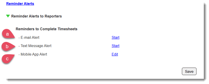 - In the section Timesheet Reminder Alerts to Reporters, click Edit.