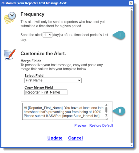 - You can choose how many days after the timesheet period closes the reporter receives a text.