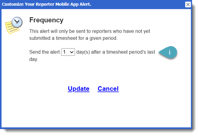 - You can choose how many days after the timesheet period closes the reporter receives a mobile app alert.