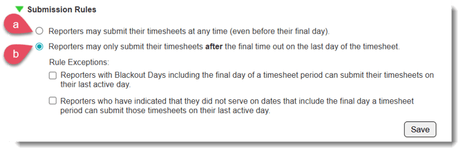 The Submission Rules section of your timesheet template allows you to set the rules around when a reporter can submit their timesheet
