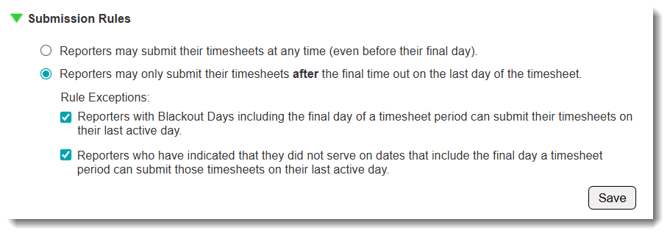 WARNING (Compliance): Some programs (e.g. AmeriCorps) require that reporters do not submit timesheets before they have finished serving for that time period. For these programs, these settings are recommended: