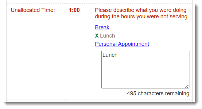 Unallocated Time is any “leftover” time on a timesheet day after hours have been assigned to categories or subcategories. It is the primary tool for capturing lunches, breaks, and other periods that fall between a reporter’s Time In and Time Out but are not covered by existing options.