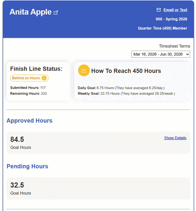 Finish Line Status is a powerful tool that helps you and your reporters stay on track to meet their Goal Hours. It shows whether a reporter is Ahead, On Track, Behind, or Really Behind — and provides actionable data, like how many hours they need to average per day or week to successfully complete their term by their Personal End Date.